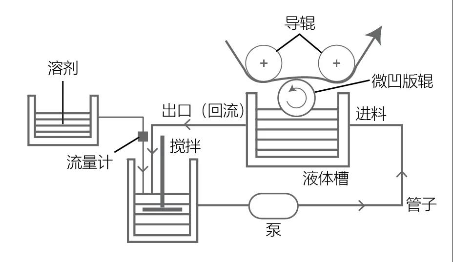 為了解決這個問題,可以在使用微凹的時候,進(jìn)行回流,使得涂布液處于一個流動的狀態(tài),不容易結(jié)皮,同時在回流的時候根據(jù)溶劑的揮發(fā)速率進(jìn)行溶劑的補充,從而進(jìn)一步降低溶劑揮發(fā)所帶來的影響。